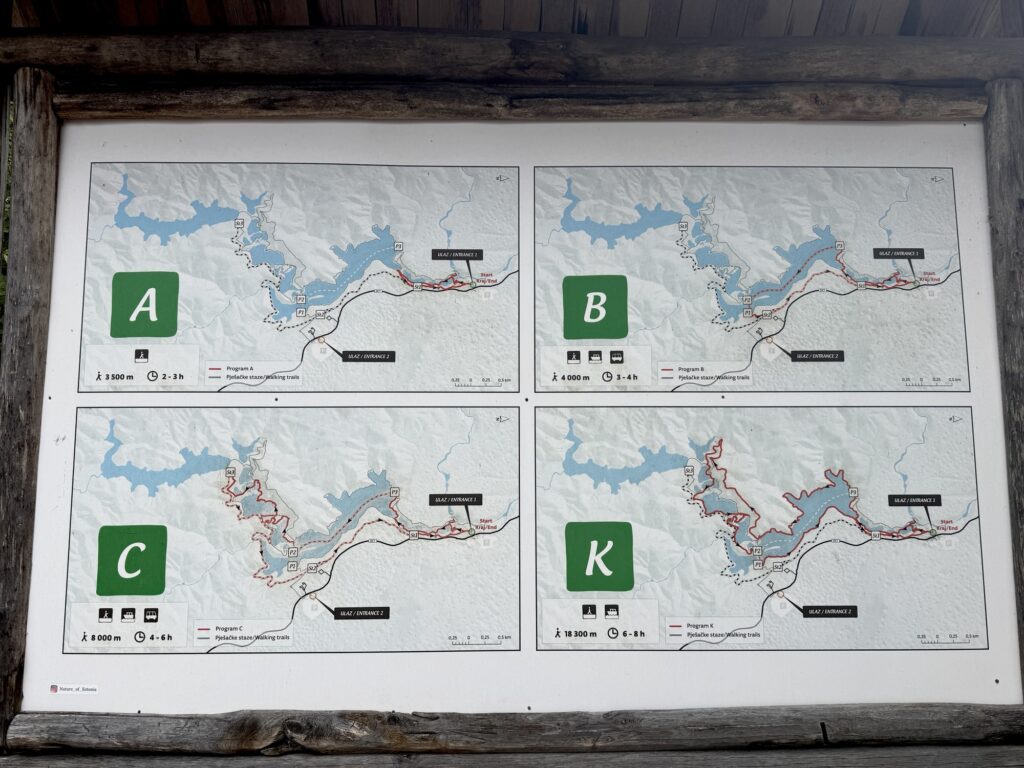 - Route B is 4km of walking around all of the Lower Lakes trails, and includes a boat ride across Kozjac Lake, after which is a ride on the panoramic train back to the Entrance. Route B takes 3-4 hours.