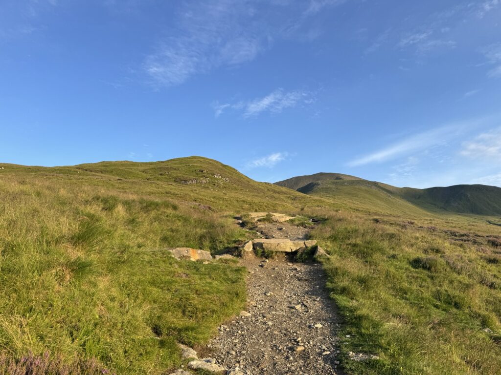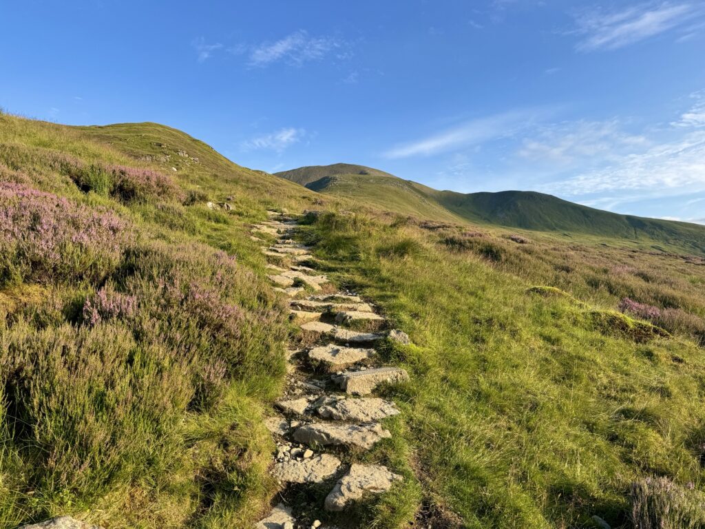 After some time, the gravel track is replaced with stone steps, making it feel a bit more ‘climby’. Not long after, the path becomes more rugged, with a mix of stones, mud and grass. I was very glad to be hiking on a dry day – I reckon this section is more often boggy than not (this is Scotland, after all!).