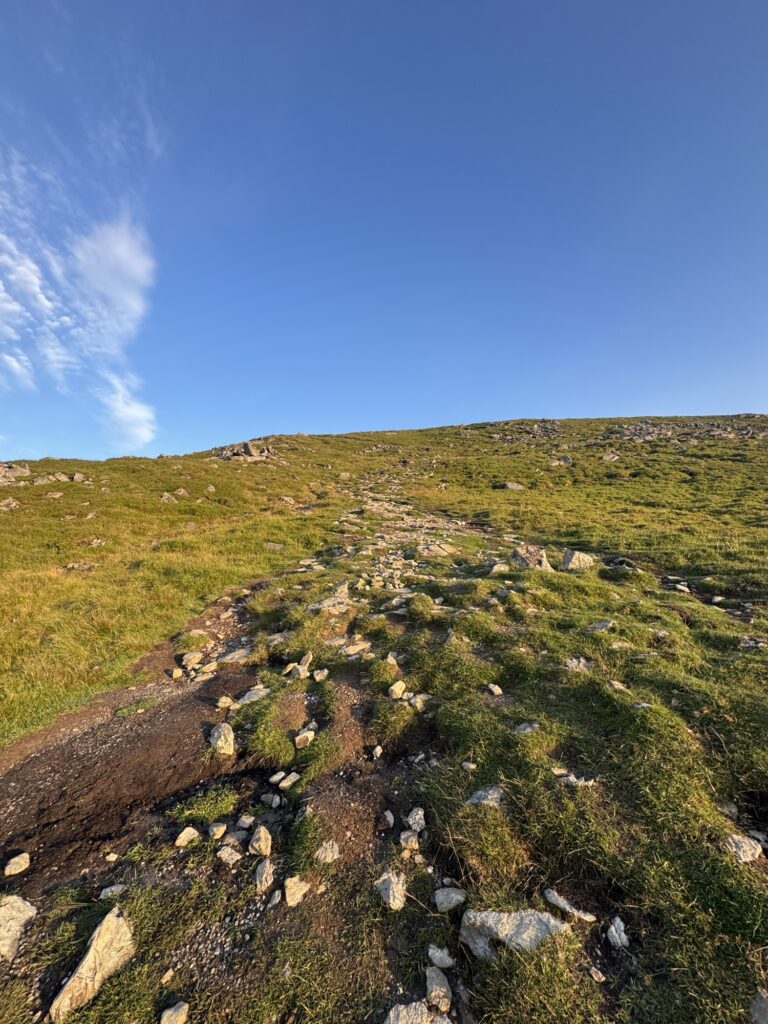 The trail begins on the easiest terrain – a wide gravel track that climbs gradually alongside the Ardvorlich Burn. Trying to walk ‘fast’ to help beat the sunset to the top was pretty easy here – the path is very obvious and requires little thought, making for a vibey start!