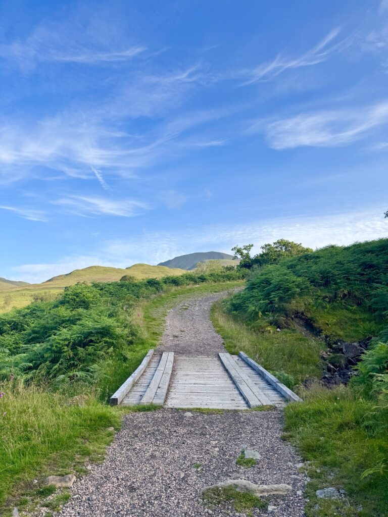 There are a couple of small rocky patches where water runs across the trail, as well as a wooden footbridge (or two) to safely cross the burn. They make for a little change from the gravel, while reminding you that the terrain can, and will, change as you hike!