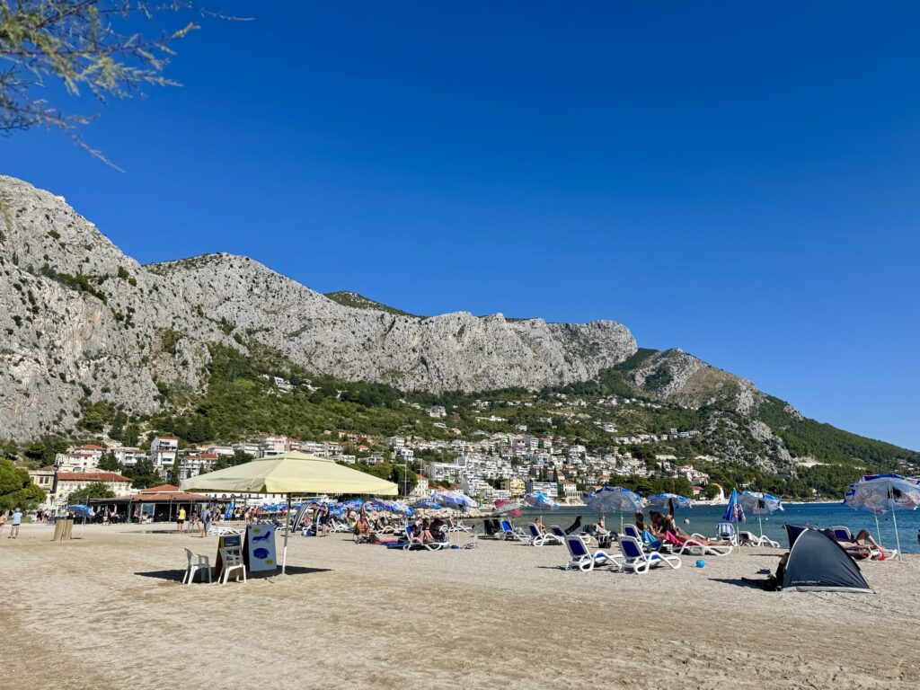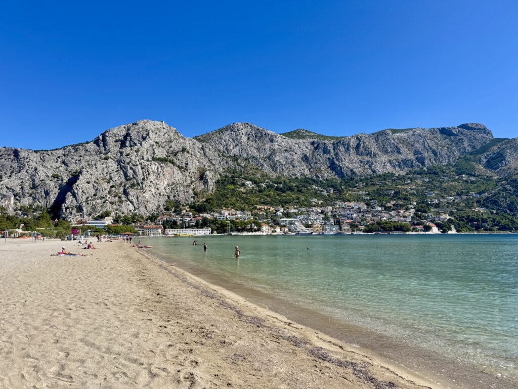 Brzet Beach is around a 15-20 minute walk from the Old Town area, on the same side of the Cetina River. This pebble beach is beautiful, and if you head right to the end, you’ll reach a small section where the shoreline curves around slightly, so you can sunbathe with a direct view back towards Omiš centre – a desirable scene with the mountains towering behind the town.