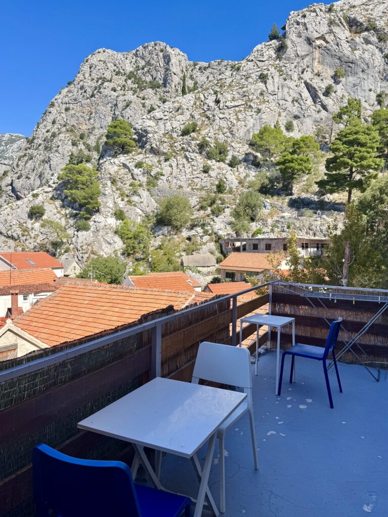 - Terrace with breathtaking views: The terrace offers views of the Cetina River and surrounding mountains – a favourite feature for me. There are tables and chairs out here, so you can enjoy a meal you cooked in the hostel kitchen (or a takeaway) while taking in the scenery. The views make it feel like staying somewhere far more upscale than a typical budget accommodation!